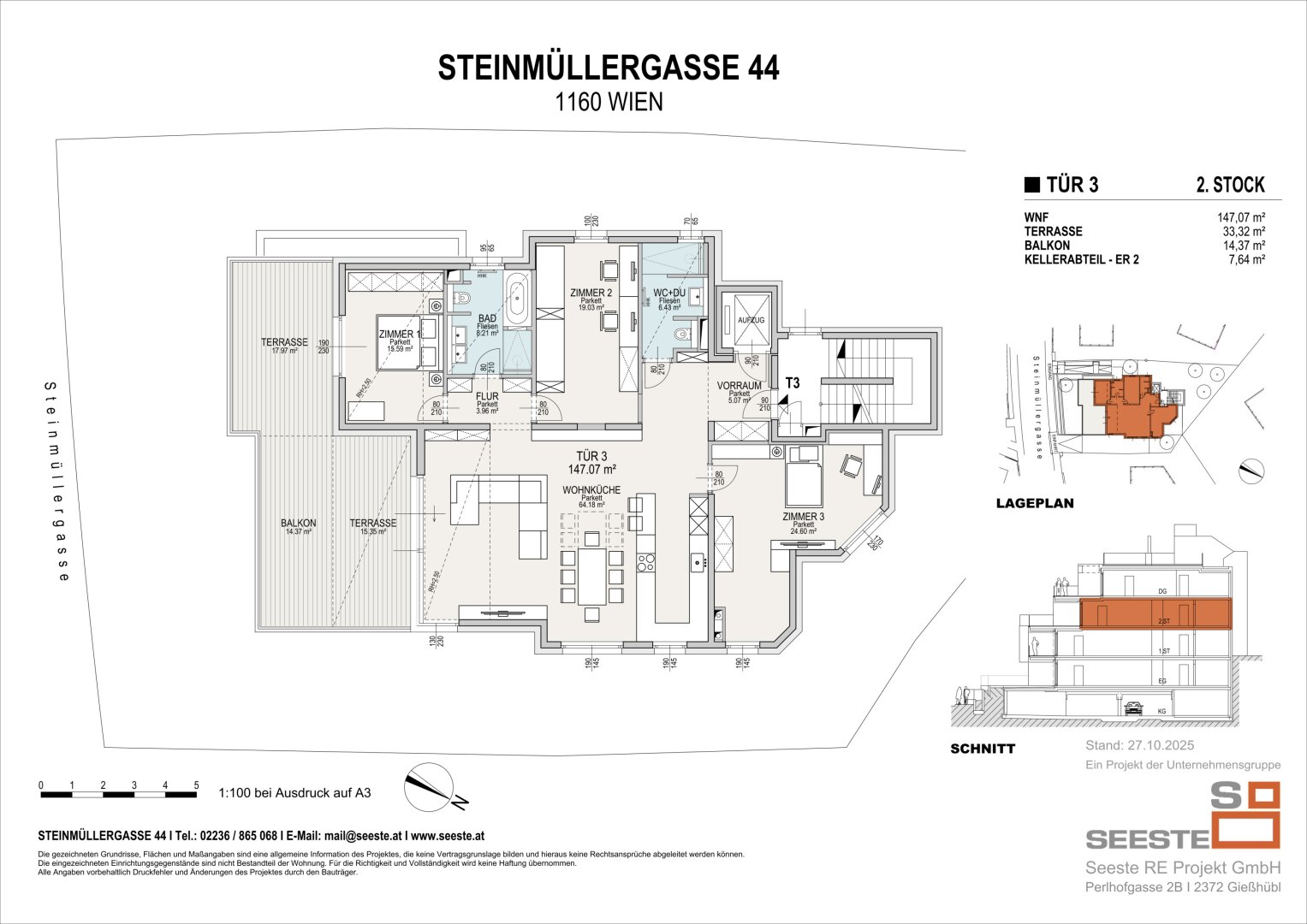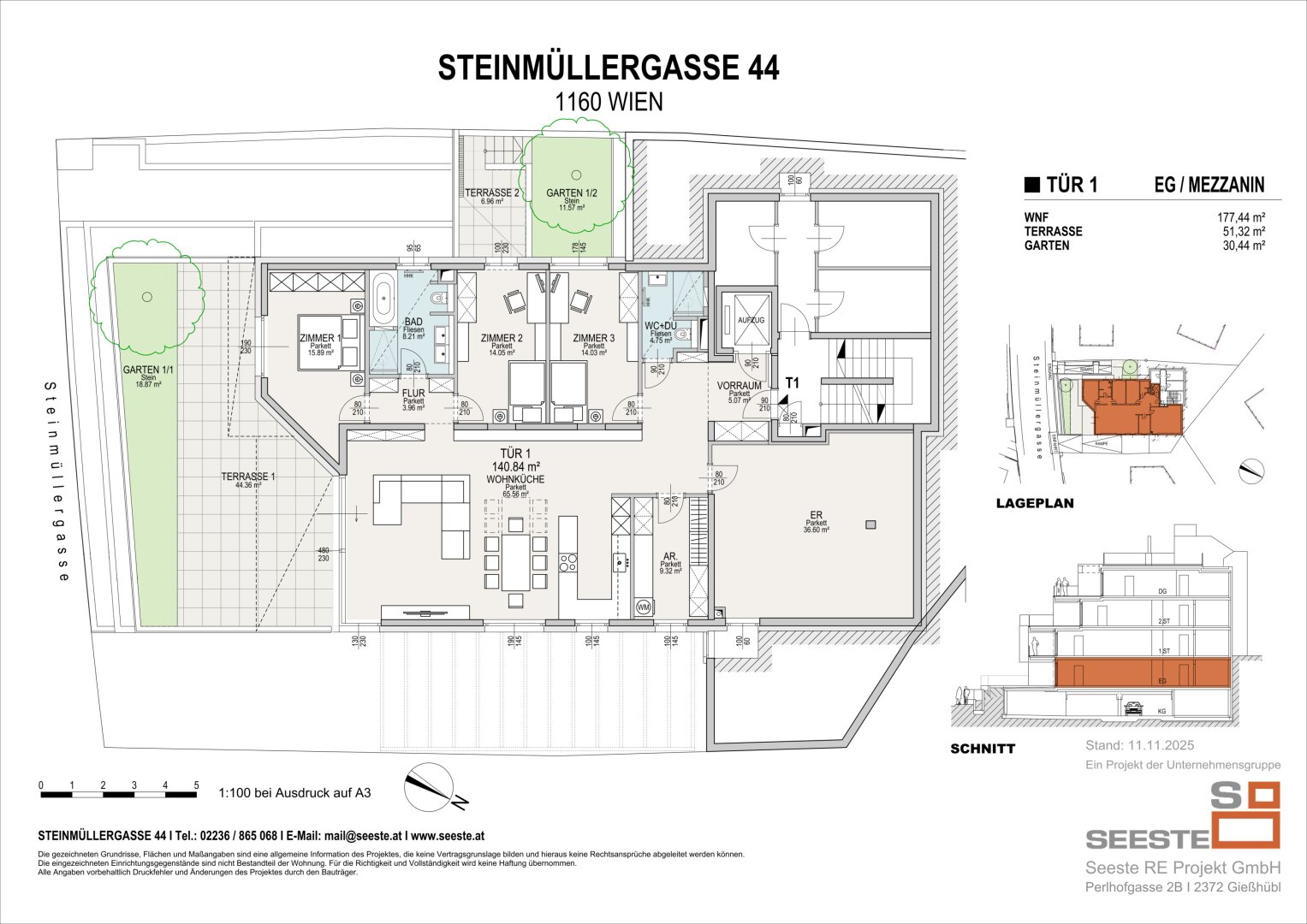 Folder Steinmüllergasse 44 Bau- und Ausstattungsbeschreibung Energieausweis Video: Ausblick vom Grundstück Grundriss Tür 3 Erdgeschoss Mezzanin Lageplan Kellergeschoss Souterrain Tiefgarage RegelschnittExklusive Eigentumswohnung mit großem Garten.